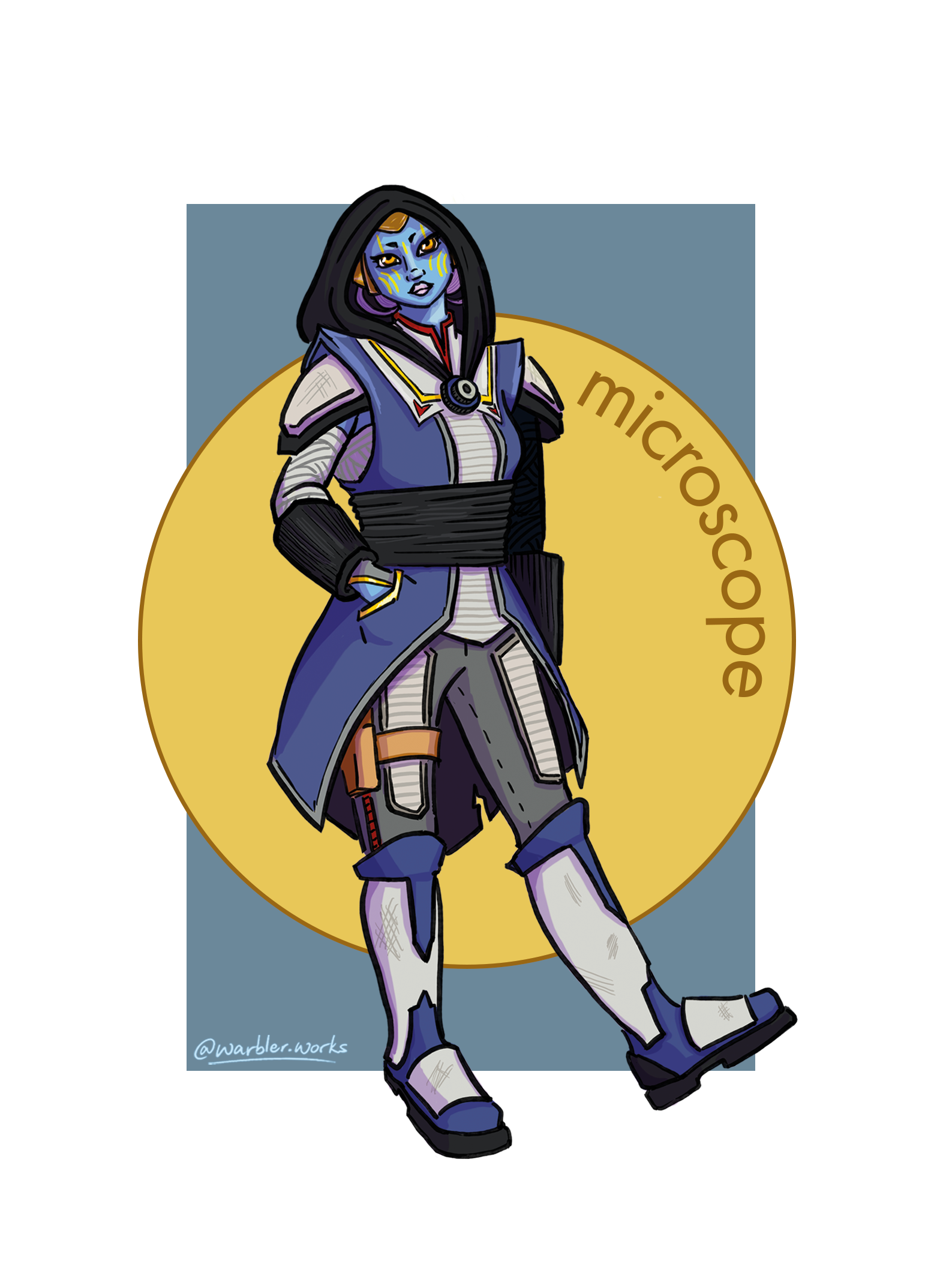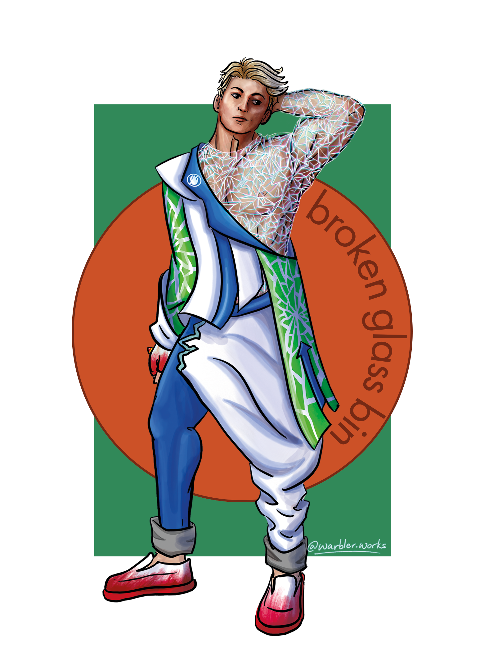 An X chromosome jumpsuit consisting of an inner and outer shell. The inner shell consists of a deep-plunge lycra one piece and leggings with gold DNA cutouts. The outer shell consits of a sculpted sheer liquid organza shoulder pads and harem-styled bottoms. Accessorize with a centromere belt, and dual colored floursence heels.
